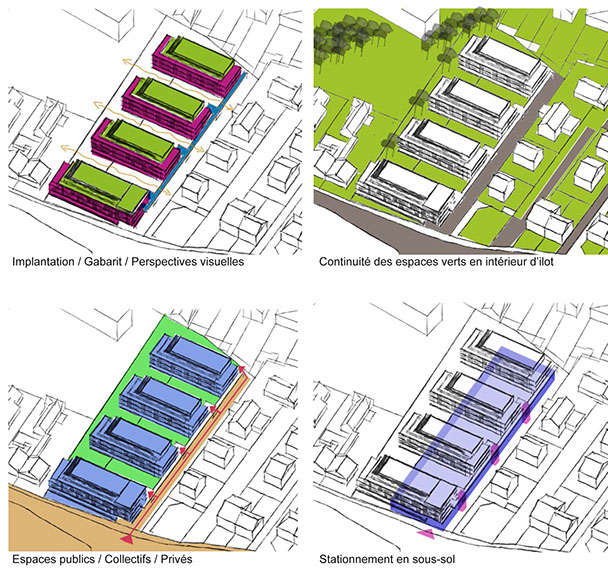 GOSPEL Architectes Maître d'Ouvrage : Espacil Construction Surface : 4 600 m² SP Coût : 4 460 000 € HT Calendrier : Concours 2013 Programme : Immeuble de 58 logements sur le site de l’ancienne Direction d’Aménagement et d’Urbanisme de la ville de Saint Jacques-de-la-Lande. - 25% de locatif social - 25% en accession sociale - 50% en accession libre Les bâtiments ont été conçus sur un principe constructif constitué d’un noyau homogène sous la forme d’un parallélépipède compact. Cela favorise la performance thermique des étages qui sont distribués par un escalier et des coursives implantés en façade Nord pour que tous les logements puissent être orientés au Sud ou au Sud-Ouest.